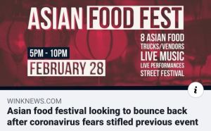 News stories, advertisements, opinions, and memes have all done nothing more than to stir up racism in the middle of this crisis, which is not going to help.  You cannot get Corona virus by eating Chinese takeout or going to an Asian festival.  You do not look at anyone who is Asian, and wonder, “do they have the virus?”  At this point, any ethnicity either has the virus, or has the capacity to have the virus.  And you cannot tell who has the virus by their looks.