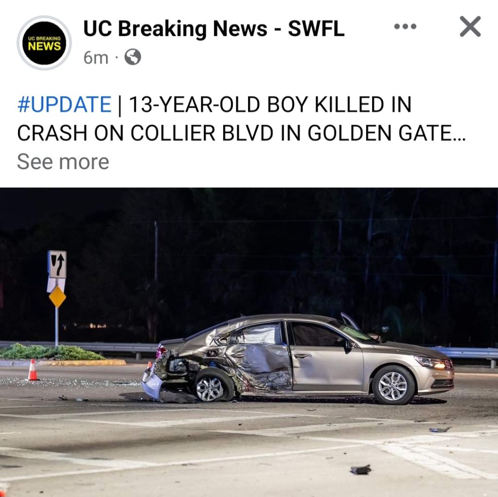 The picture is a screenshot from my phone, credited to local news agency, UC Breaking News – SWFL. The headline reads, “13-Year-Old Boy Killed In Crash.” Again, as I mentioned, daily car crashes here are not uncommon, and it seems that deaths or at least severe injuries occur nearly every day. There were not many details released. A car, driven by a 17-year-old girl, had three passengers, two aged 13 years of age, and a 10-year-old. She attempted to make a left turn, thinking she had the right of way, or at least enough distance, and instead was hit by another vehicle, being driven by a 30-year-old father, and his 3-year old child. This turn was attempted at night. The accident is being investigated. But one definite fact has been reported, a 13-year-old boy was killed in the accident.